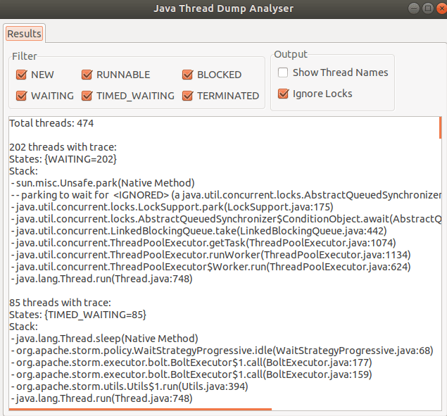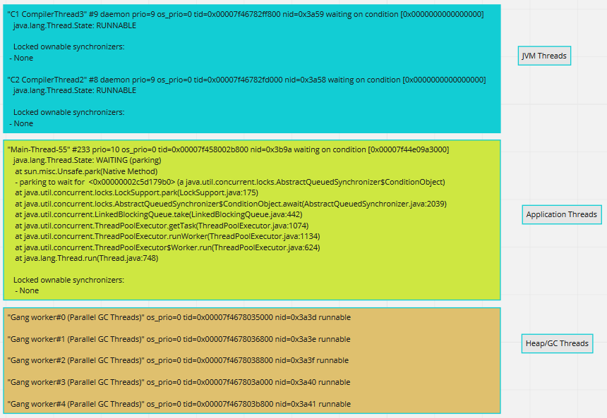This tool is available as a jar, to which you can feed the Thread dump file via command line and visualize Threads grouped in there States. You would appreciate this grouping if you have analyzed Thread Dumps in vim which had 100’s and 100’s of lines.