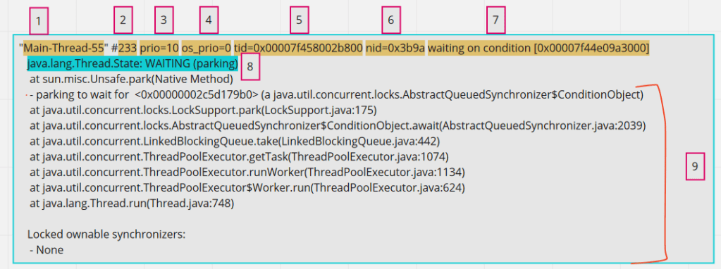 1 – Thread name, obvious and straight forward . 2 – Number id of thread. This will get incremented everytime there is a new thread created for that thread pool. 3 – JVM priority. This number signifies the priority of the thread in JVM. Java exposes api for setting thread priority. 4 – Priority of a thread on the operating system. 5 – Thread id for the thread in the memory 6 – Native thread id assigned to JVM by OS. This is important of correlating JVM threads with OS threads. 7 – This is optional seen only when the thread is waiting on some condition. May not be always. 8 – Thread state. In my opinion, this is overrated and generally over-analyzed. Reflect the current state of the thread. 9 – Thread call stack. Reads bottom-up. Gives the stack of thread.