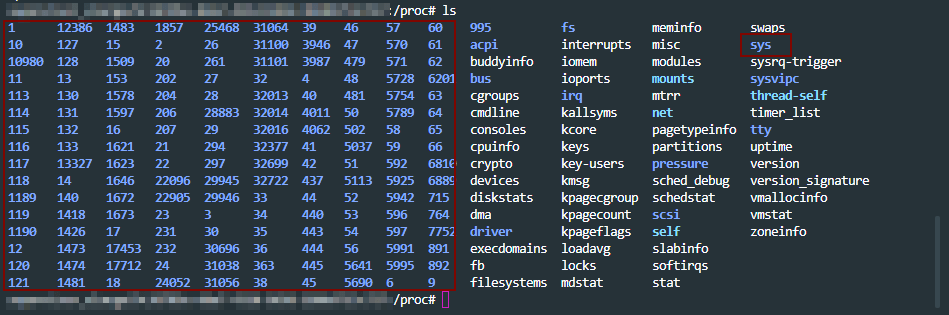 a look into /proc path. pids, sys highlighted. Rest are status files.